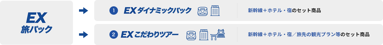新幹線+ホテル・宿がセットになった「EXダイナミックパック」、新幹線+ホテル・宿や旅先の観光プラン等がセットになった「EXこだわりツアー」の2種類があります。